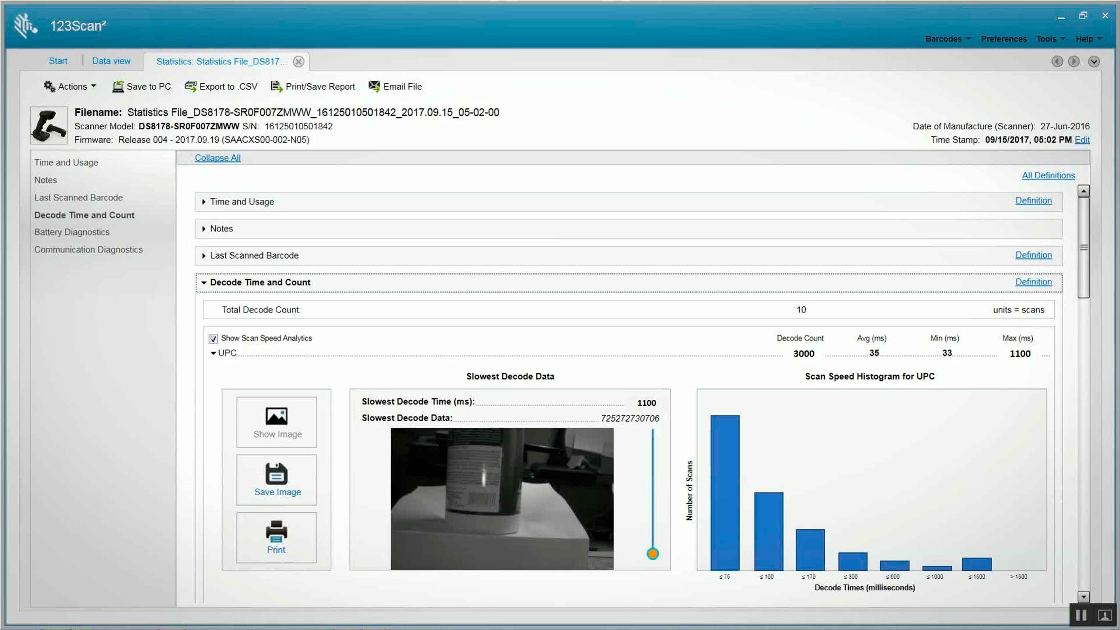 Poorly printed or out-of-spec barcodes can negatively impact your business. ScanSpeed Analytics automatically charts every barcode that gets scanned by its symbology and decode time. Across your fleet, you can easily identify the poorest performers and take action.