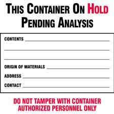 THIS CONTAINER ON HOLD PENDING ANALYSIS CONTENTS, ORIGIN OF MATERIALS, ADDRESS, CONTACT Labels