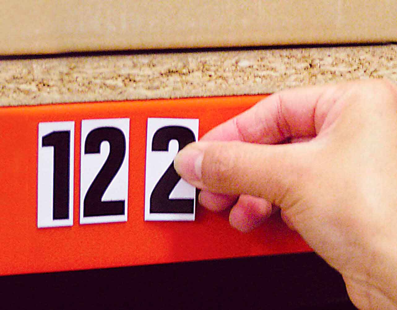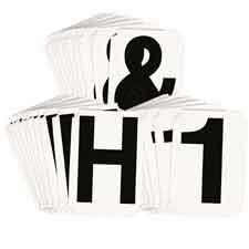 Numbers and letters labels identify equipment, bins and areas of the warehouse required by facility safety and maintenance. Adhesive number and letter stickers can be used to mark tool cribs, bins, shelves, poles, panels, switches and equipment. These labels made of self-sticking vinyl for fast general purpose indoor or outdoor marking. Aluminum embossed characters and high-visibility aluminum utility panels are available for marking utility poles in outdoor environments. Reflective and glow-in-the-dark numbers and letters are also available.